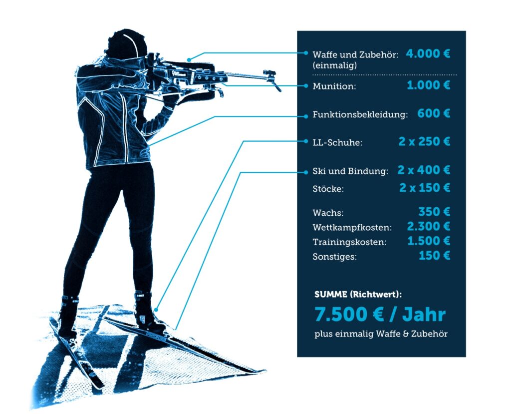 Neben den genannten Anschaffungen enstehen weitere Kosten, wie zum Beispiel für Sportuntersuchungen, Trainingslager oder für den Erhalt und die Wartung der Schießanlage/des Loipengerätes.